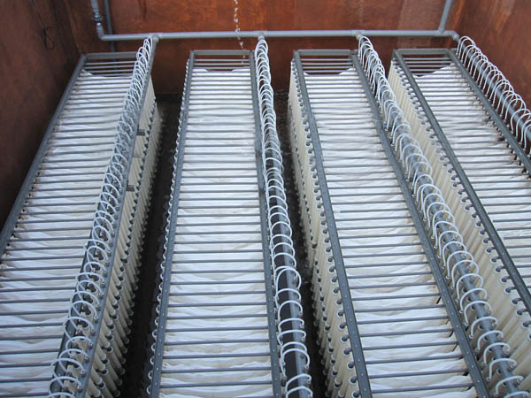 當有足夠數(shù)量的有機營養(yǎng)物、礦物鹽和溶解氧時,微生物在填料的表面繁殖,逐步形成畫膜。由于擴散作用,氧和營養(yǎng)物質(zhì)通過膜供微生物吸收利用。當膜長到一定厚度就會妨礙這種擴散,水中的氧和營養(yǎng)物質(zhì)不能通到內(nèi)層,生物膜開始分層,表層是好氧層。面內(nèi)層由于缺氧形成厭氧層。新形成的厭氧層內(nèi),好氧菌死亡溶解,成為兼性厭氧菌和厭氧菌的營養(yǎng)。當內(nèi)層膜營養(yǎng)耗盡,厭氧微生物也大量死亡溶解,于是生物膜內(nèi)層不能支撐表面的生物群體,大塊的生物膜脫落。生物膜脫落而造成的更新面又會形成新的生物膜。另外少量的生物和一些小塊生物膜,由于水的沖刷或氣泡振動,不斷離開生物膜進人水中,這就是膜的脫落和更新。膜的脫落和更新對生物膜的活性有積極的作用,可以使生物膜保持穩(wěn)定的生物活性。脫落的膜沉淀后被排出系統(tǒng)。脫落和更新對水質(zhì)也有一定的影響,增加了水的濁度。
