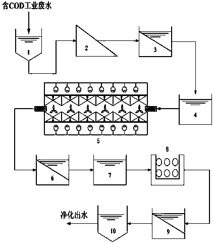 工業(yè)廢水通過廢水管線進入集水井,集水井的出口通過廢水管線連接粗格柵,粗格柵的出口通過廢水管線連接一次沉淀池,一次沉淀池的出口通過廢水管線連接pH值調節(jié)池,pH值調節(jié)池的出口通過廢水管線連接納米微孔超聲波間歇聚合反應槽,納米微孔超聲波間歇聚合反應槽的出口通過廢水管線連接二次沉淀池,二次沉淀池的出口通過廢水管線連接曝氣硝化池,曝氣硝化池的出口通過廢水管線連接生物脫氮池,生物脫氮池的出口通過廢水管線連接三次沉淀池,三次沉淀池的出口通過廢水管線連接凈水池,凈水池的出口通過廢水管線將經(jīng)過本系統(tǒng)處理后的凈化出水外排;其中,納米微孔超聲波間歇聚合反應槽的槽體采用高強度玻璃鋼材質,其頂板和底板上各并排裝有8支超聲波發(fā)生器,槽體中部設有上、下兩道不銹鋼網(wǎng)狀龍骨,分別用于固定上、下兩組納米微孔表面聚合體,兩組納米微孔表面聚合體中央安裝了6支攪拌槳葉,槽體左側設有進水閥門,右側設有出水閥門;經(jīng)過酸化的工業(yè)廢水通過納米微孔超聲波間歇聚合反應槽左側的進水閥門進入反應槽內部,16支超聲波發(fā)生器開始工作,發(fā)出超聲波,廢水中的有機物在超聲波協(xié)同化學效應的作用下,在納米微孔表面聚合體的表面發(fā)生C-H鍵的短暫斷裂,由于納米微孔表面聚合體材料中添加有能夠催化聚合反應進行的氯化烯丙基鈀二聚物,在其催化聚合作用下,已經(jīng)斷裂的C-H鍵會迅速在納米微孔表面聚合體的納米孔隙處發(fā)生C-H鍵的再結合,從而在納米微孔表面聚合體的表面發(fā)生聚合反應,超聲波發(fā)生器開啟一定時間后即停止工作,同時兩組納米微孔表面聚合體中央的6支攪拌槳葉同時開始攪拌以產(chǎn)生液體湍流作用,這會使剛剛形成的有機物聚合體的分子量不斷增大,逐步匯聚成大顆粒的不溶物質并從納米微孔表面聚合體表面脫落,以懸浮物的形式分散于廢水中,并隨廢水通過反應槽右側的出水閥門排出反應槽,進入二次沉淀池,并最終通過沉淀過程從廢水中加以除去,同時,納米微孔超聲波間歇聚合反應槽中的攪拌槳葉停止工作,超聲波發(fā)生器重新開啟,并通過進水閥門重新注入廢水,開始新一輪催化聚合反應過程,如此往復循環(huán);其中,pH值調節(jié)池的作用是將經(jīng)過一次沉淀的廢水pH值調節(jié)至1.5~3.0,以滿足納米微孔超聲波間歇聚合反應槽的入水pH值要求;其中,曝氣硝化池的作用是通過好氧曝氣過程,使廢水中的各種含氮物質均轉化為硝酸鹽氮;其中,生物脫氮池的作用是通過生物活性反應過程,將廢水中的硝酸鹽氮分解轉化,從而去除硝酸鹽氮。