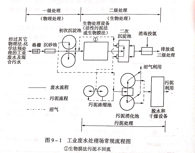 為達(dá)到國(guó)家污水排放標(biāo)準(zhǔn),一般的廢水處理場(chǎng)都采用一級(jí)處理(物理法或化學(xué)法)、二級(jí)生物法處理的處理流程(見(jiàn)圖9-1),為避免工業(yè)廢水水質(zhì)不均衡引起對(duì)出水水質(zhì)的影響,在二級(jí)生物法處理前后分別設(shè)置均質(zhì)調(diào)節(jié)池(事故池)和監(jiān)測(cè)池。